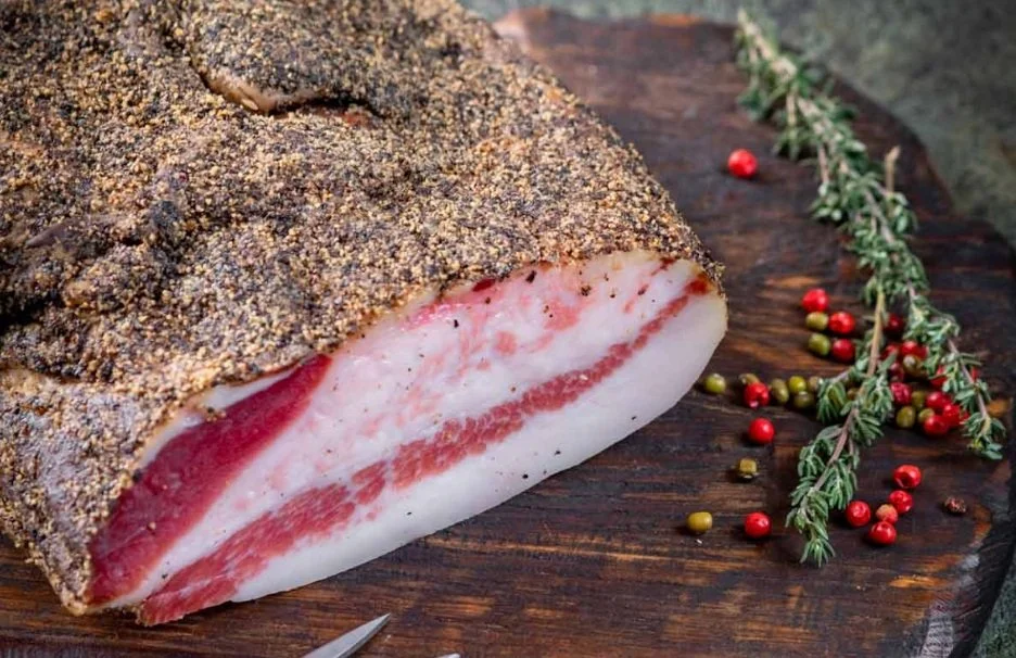 Guanciale is a traditional Italian cured pork cheek or jowl known for its rich, fatty texture and deep, savory flavor. Unlike pancetta or bacon, it is dry-cured with salt, pepper, and spices, over the course of five days, then air dried for several weeks after which point it is virtually shelf-stable indefinitely. Guanciale is a key ingredient in classic Italian dishes like carbonara, amatriciana, and gricia, where its rendered fat adds a silky, umami-rich depth to sauces. Simply slice off a piece and melt in your pan to sauté or fry your vegetables and meats.